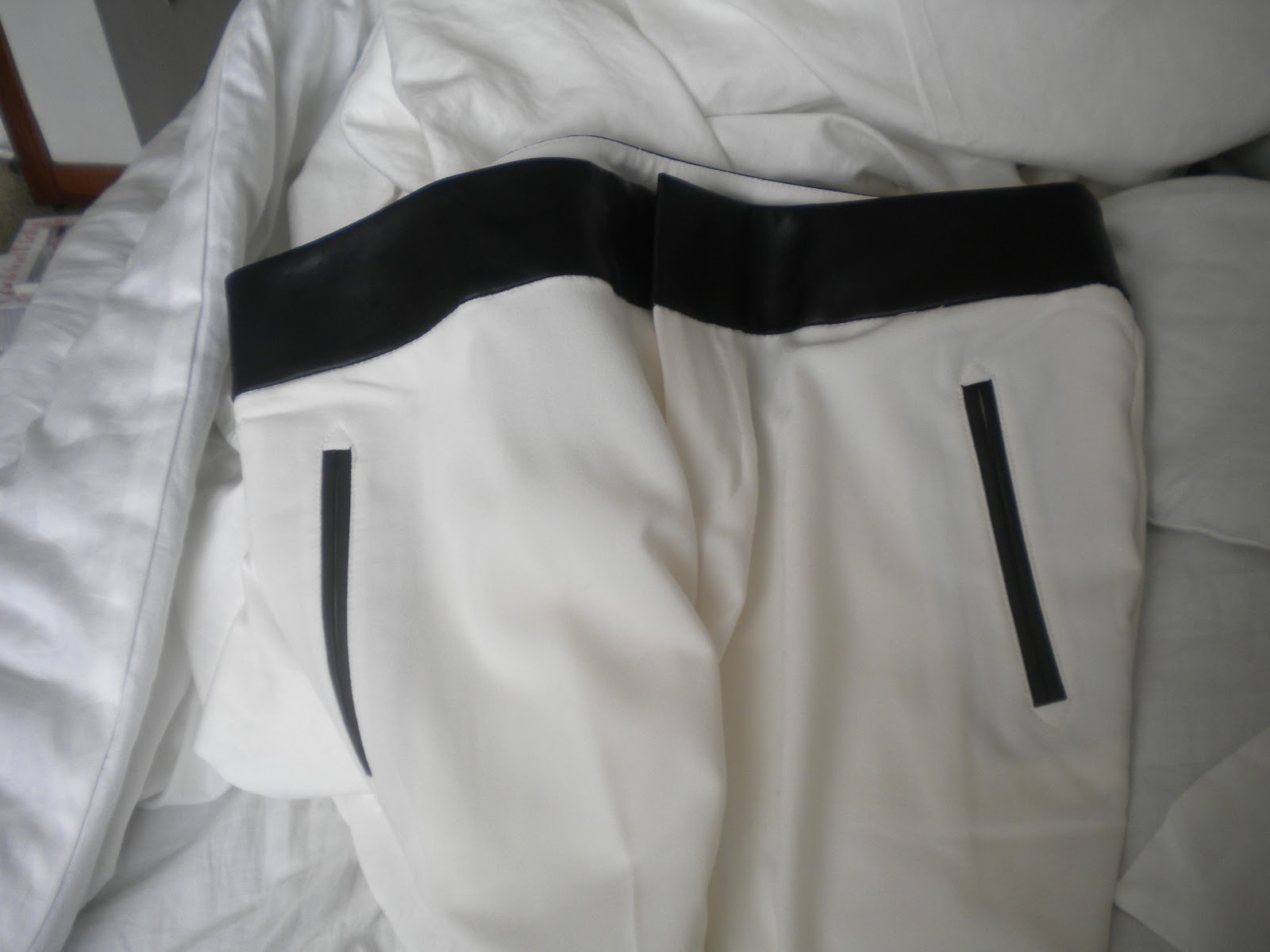 White dress pants with black leather detail