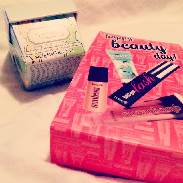 Benefit Cosmetics has always had a special place in my heart. From when they first won me over with their bad gal lash mascara, to later on when I discovered watt's up! highlighter - I have always been a huge fan. When I entered Ulta last night, they really pulled at the heart strings by offering FOUR AMAZING PRODUCTS FOR FREE! All I had to do was spend $35. Done. I've been meaning to buy an eye cream and let's face it: it's not the most exciting thing to purchase, but you need it in your life. Who can make a not-so-fun purchase fun? Benefit. By offering my favorite mascara, a primer I've been DYING to try, a luxurious golden bronze highlighter for the upcoming summer months and the perfect pink-nude lip gloss to match.